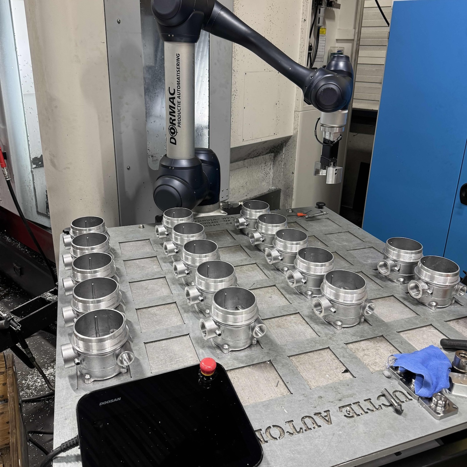 Een vijf-assig bewerkingscentrum waarmee we de meest complexe CNC bewerkingen in één opspanning doen. Deze machine is voorzien van een robotbelading, die ons in staat stelt doorlooptijden heel kort te houden.